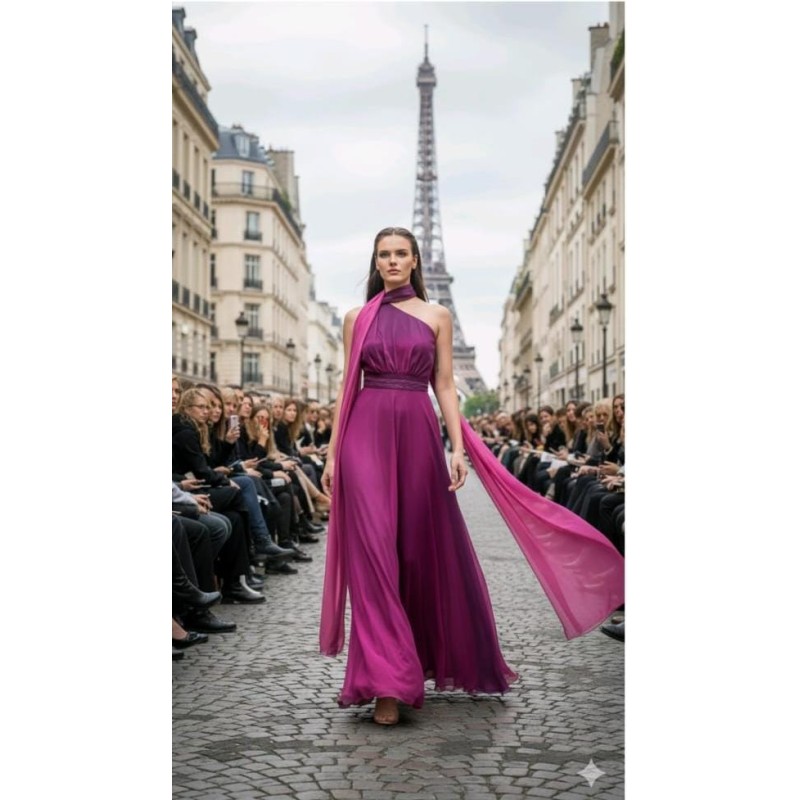 Vestido largo para madrina con detalle de plisado en cinturón y puño y capa trasera.
