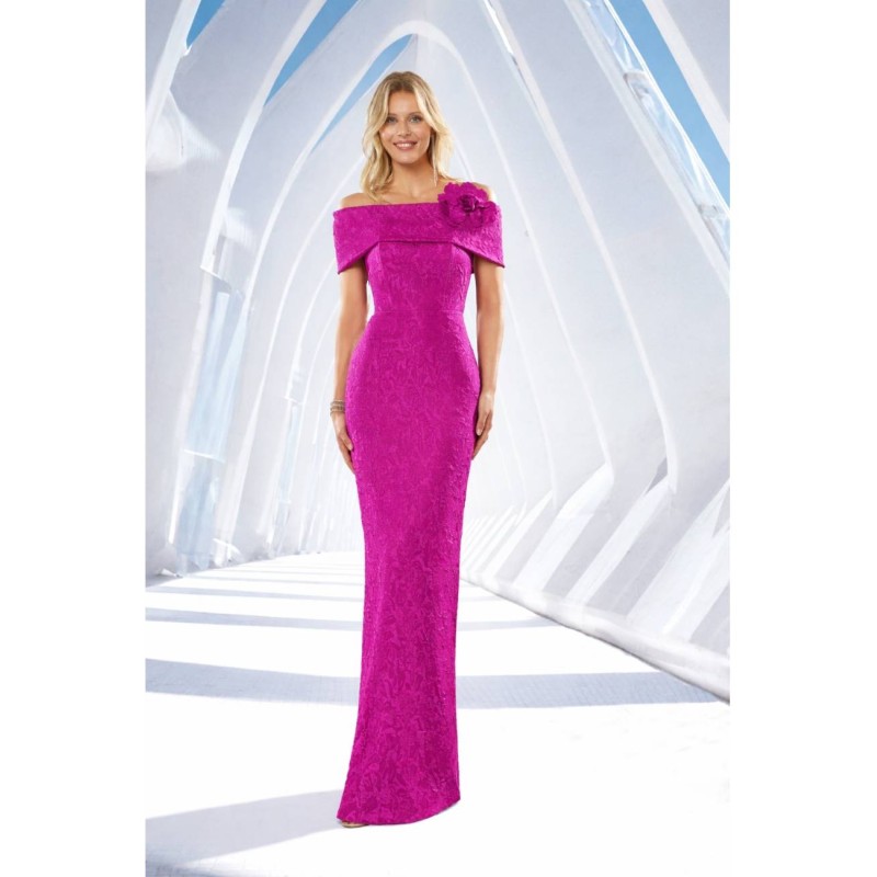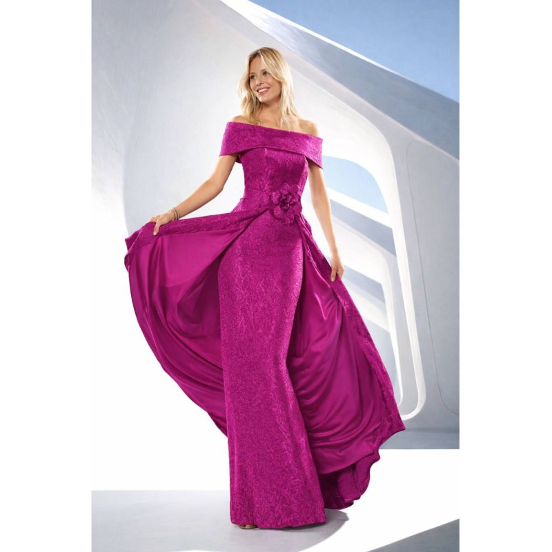 Vestido largo con diseño de hombros descubiertos que realza el cuello y los hombros de forma femenina. El cuerpo entallado define la figura, mientras que la falda fluida con sobrefalda abierta aporta movimiento y sofisticación. Destaca el delicado adorno floral en la cintura, vestido con tres posturas diferentes como se aprecia en las fotos.